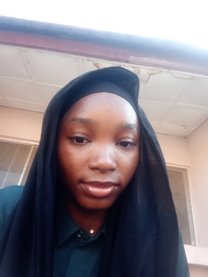 A young woman with dark skin and brown eyes poses for a selfie. She wears a dark green collared shirt and a black headscarf, exposing her face. A thin gold necklace with a small, round pendant adorns her neck. The background features a beige-colored wall and two visible windows with white frames. The lighting appears natural, suggesting an outdoor setting.