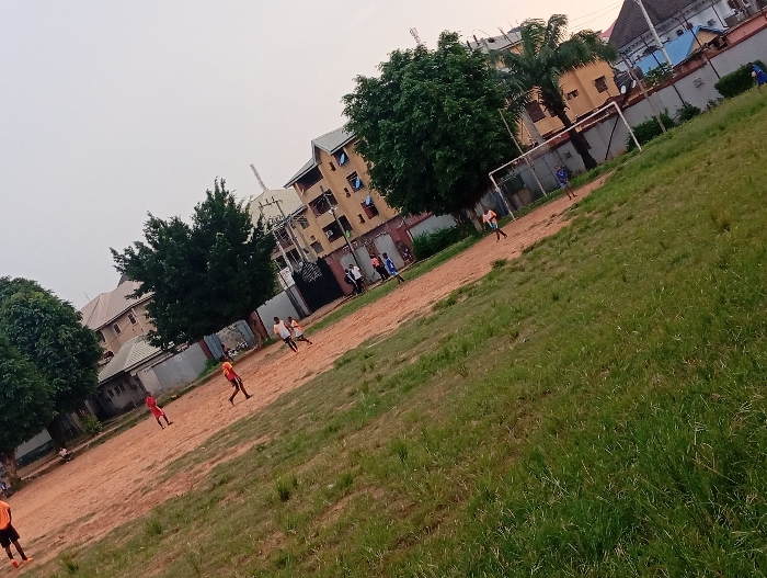 The image depicts an outdoor football field located in an urban area of Onitsha, Nigeria
