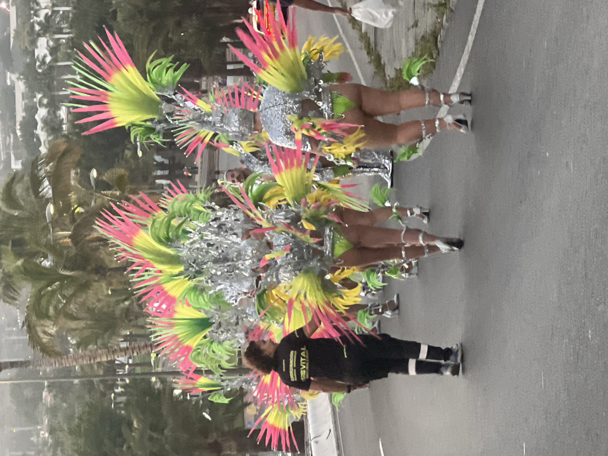 A vibrant procession is captured on an overcast day in San Bartolomé de Tirajana, Spain, likely during a Carnival celebration. Predominantly on a gray asphalt street, a group of participants, mostly women, are adorned in elaborate, brightly colored costumes. These costumes feature tall, radiating arrangements of pink, yellow, and green feathers, complemented by shimmering silver and green body pieces. The dancers are wearing high-heeled shoes and leg jewelry. To the left of the parade, blurred palm trees and buildings create a backdrop. In the foreground, a person in a black shirt and pants walks alongside the parade.