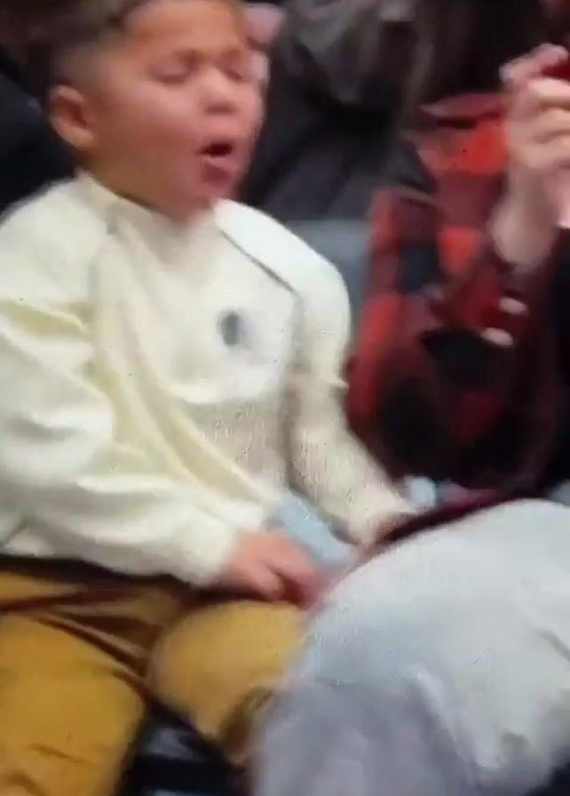 two young boys in an audience. The first boy wears a cream-colored jacket and brown pants and sits down after jumping in surprise. The second boy wears a green hooded sweatshirt and a white beanie. He holds his hand up to his face in surprise. They are among a crowd of people seated in bleachers.