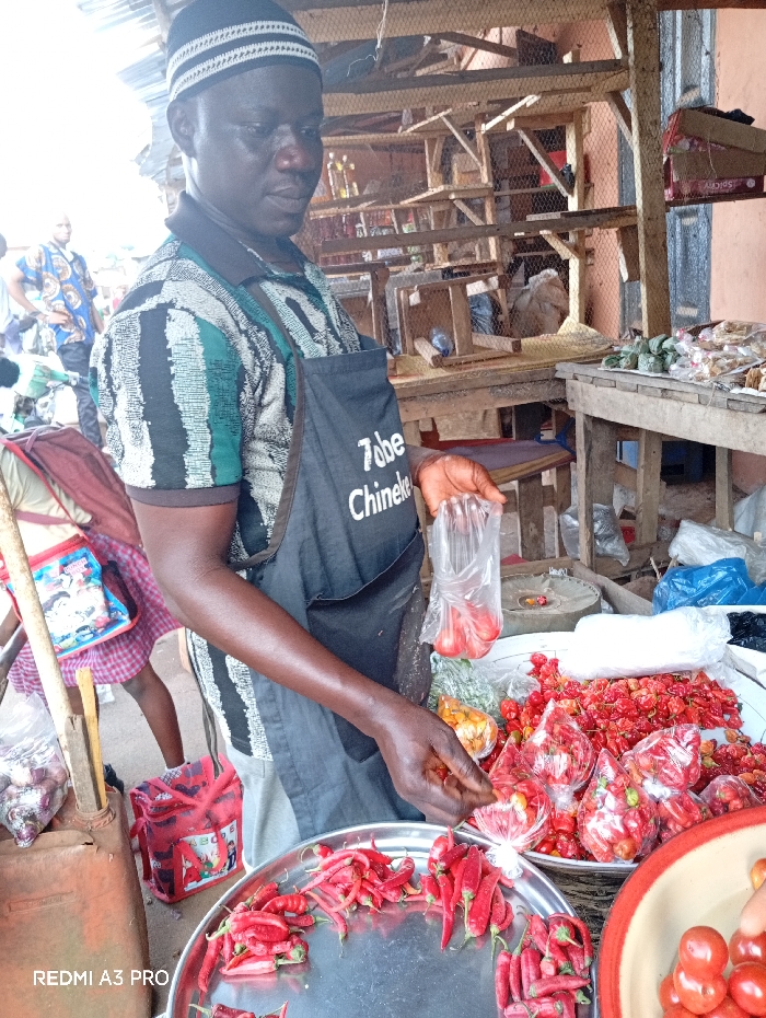 This image captures a market scene in Akokwa, Nigeria. The central figure is an adult male with a dark complexion, wearing a black and white patterned kufi cap, a patterned short-sleeved shirt primarily green, black, and white, and a black apron inscribed with partially visible white text "7abe Chineke." He stands behind a stall, looking downwards and slightly to his right, engaged in handling produce. His right hand holds a small clear plastic bag containing several red cherry tomatoes. His left hand is positioned near a silver circular metal tray filled with numerous fresh red chili peppers. The stall displays an abundance of produce. To the right of the silver tray, a larger area is covered with piles of red chili peppers, many pre-packaged in conical clear plastic bags. A bowl containing additional red cherry tomatoes is visible in the far right foreground. In the background, behind the main figure and the produce, rudimentary market stall structures constructed from wooden beams and netting are apparent. A corrugated metal roof is overhead. Other individuals are partially visible in the wider market environment. To the mid-left, a person wearing a blue and white patterned shirt is partially obscured. Further left and lower, the legs and lower torso of another individual wearing a red and white plaid skirt are visible, along with a red bag featuring cartoon characters. A reddish-brown plastic jerrycan rests on the ground in the far left foreground. The background also shows various market items, bags, and a reddish-orange wall. The scene depicts a typical commercial exchange or preparation within a bustling open-air market setting.