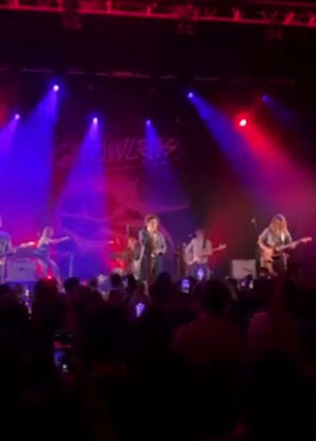 band performing on a stage to a crowd of people. The band has a male lead singer, and other members play instruments including guitar, bass, drums, and keyboard. The stage is lit with red and blue lights. The band's logo is displayed on a screen behind them. The crowd is holding up their phones to record the performance.