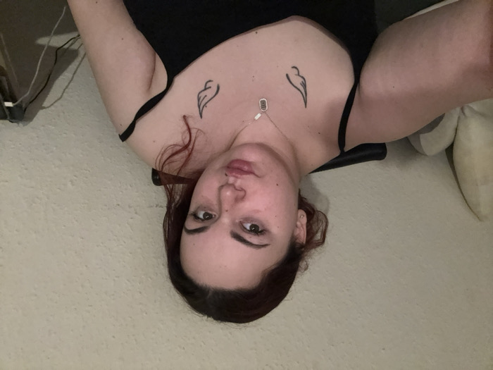 A single female subject is depicted in a medium shot, appearing to take a selfie indoors. Her head is slightly tilted, and her dark reddish-brown hair is casually styled. Her eyes are directed towards the camera, and her lips are pursed. She wears a black tank top or camisole; the left strap (from the viewer's perspective) is partially off her shoulder. A silver-colored necklace with a small, elongated rectangular pendant is visible around her neck. Two identical black outline tattoos of stylized wings are present on her upper chest, one on each side. The background consists of a light-colored, textured wall. To the subject's left, a light-colored, possibly beige, cushioned object is partially visible. To her right, a dark, indistinct object with multiple visible cables is present. The specific location within Dortmund, Germany, cannot be determined from the image, but the setting appears to be a private residence or indoor room.