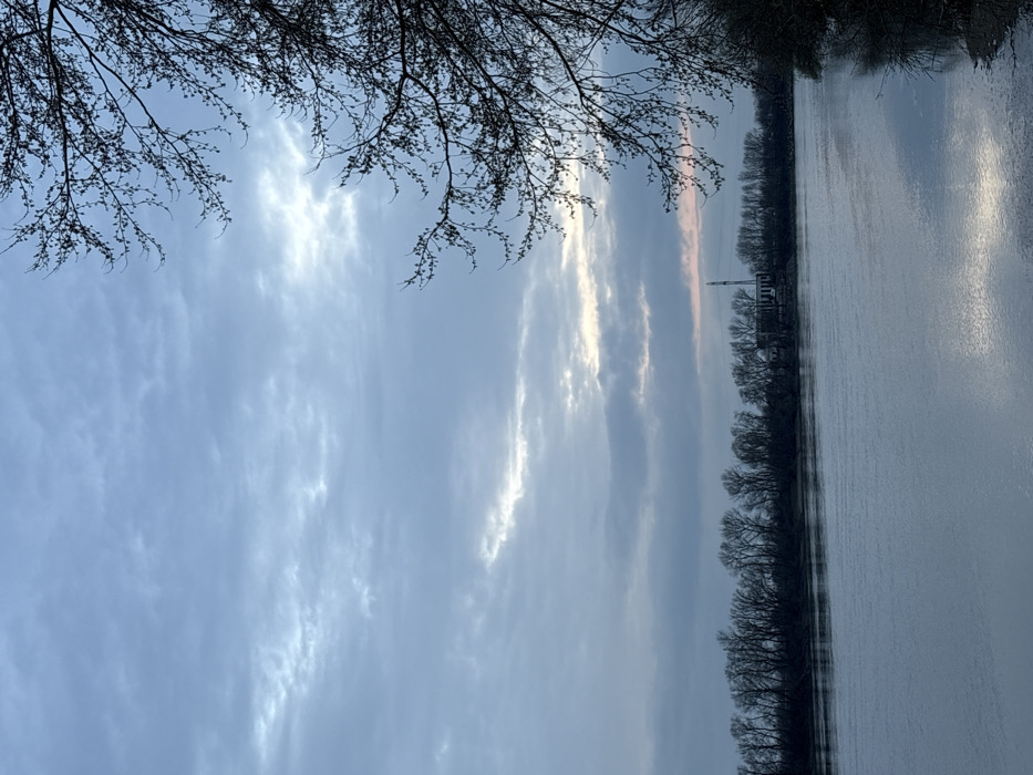 The image displays a wide, static view of the Kuban River in Krasnodar, Russia. The lower half of the frame is occupied by the calm, grey surface of the river, exhibiting subtle reflections of the overcast sky. On the far bank, a dense line of leafless deciduous trees stretches horizontally across the midground. Behind this tree line, slightly right of center, a low, elongated industrial building with visible window features is present, accompanied by a tall, slender, dark-colored lattice tower. The upper right foreground is partially obscured by dark, bare tree branches. The sky is uniformly overcast with layers of grey-blue clouds. A horizontal band of lighter clouds near the horizon, specifically towards the right, shows faint pink and orange hues, indicating either sunrise or sunset. No individuals, animals, or active movements are discernible in the scene. The overall environment suggests late winter or early spring conditions.