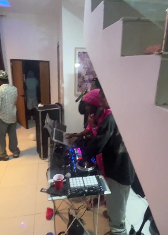 - ". The video shows three people gathered around a DJ setup in what appears to be a house. A man in a black jacket and baseball cap is holding a microphone and talking, possibly rapping or singing. A woman in a bright pink pajama set and a pink beanie is operating a laptop and DJ mixer. Another person in a black jacket stands behind them, partially obscured. The DJ setup includes a laptop, mixer, turntables, and a midi controller. A red cup is visible on the table. There's a large speaker on a stand to the left. Another person in a blue hoodie and light colored shorts is seen walking into another room. A picture is hanging on the wall behind the group, and there's a staircase to the right. The lighting is slightly dim and the video appears to be handheld. Toward the end of the video, another man wearing a patterned shirt and jeans walks by behind the DJ setup. The background music is loud and upbeat." by FM-CUCk52, licensed under CC BY 4.0