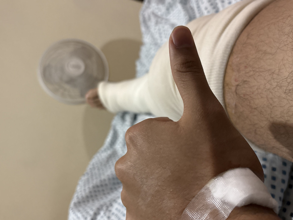 A close-up shot depicts a person lying in bed, giving a thumbs-up. The person's leg is in a full cast from the upper thigh to the toes. A wrist is bandaged with medical tape and gauze. A fan is visible at the end of the bed. The bed linens have a light blue and white pattern. The person is likely in a hospital or medical setting.