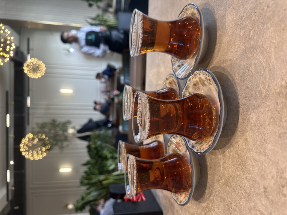 - "A vertical shot showcases a line of Turkish tea glasses filled with dark amber liquid, each resting on a small, decorated saucer" by FM-ciE9C3, licensed under CC BY 4.0