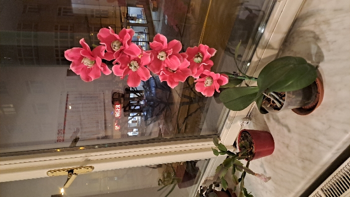 The image depicts an indoor view through a window overlooking an urban street scene at night in Pilsen, Czechia. In the immediate foreground, a white window frame with a brass handle is visible on the left. A white marble-patterned windowsill holds two potted plants: a Christmas Cactus (Schlumbergera) in a red pot on the left, and an orchid (Phalaenopsis) with exposed aerial roots in a clear plastic pot, resting on a terracotta saucer, on the right. The orchid features a prominent stem adorned with several bright pink artificial flowers, each possessing a white-green center. A white radiator grille is partially visible at the bottom left. Through the window, a commercial street is illuminated by various artificial lights. Reflections within the glass include a mirrored "asos" or "asos.cz" text. Across the street, an illuminated "B BURGER" sign, indicative of a Burger King establishment, is prominently displayed on a building. Bare trees are visible, and the ground appears to have a light covering, possibly snow or ice. Additional urban buildings with illuminated windows are discernible in the background. No people are present in the frame.