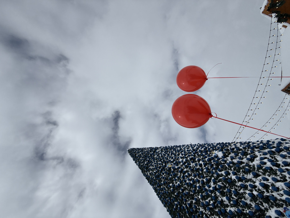 This image presents an outdoor scene in Yeghipatrush, Armenia, under an overcast sky composed of grey and white clouds. In the left foreground, a tall, conical structure, resembling a decorated Christmas tree, is prominent. It is densely adorned with numerous dark blue spherical ornaments, some of which are partially covered by a fine layer of snow. The structure tapers towards an apex that extends beyond the top of the frame. To the right of this structure, two red, inflated, spherical balloons float in the mid-air. The left balloon is slightly larger and positioned slightly lower than the right balloon. Each balloon is attached to a thin red string extending downwards. Horizontally across the lower middle of the frame, a string of small, warm-toned lights is suspended. In the lower right corner, portions of snow-dusted, gabled roofs of dark-timbered or similarly constructed buildings are visible. No individuals or active interactions are depicted.