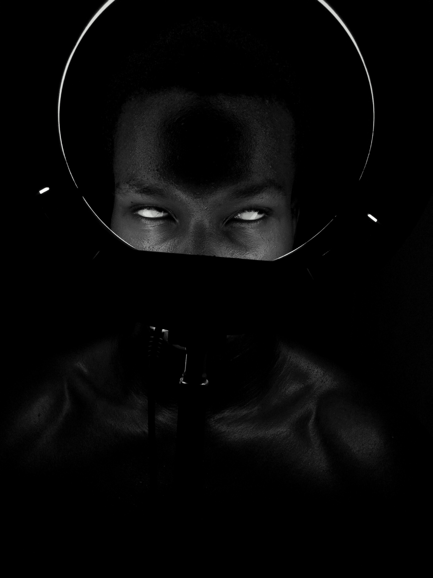A black and white portrait shows a person with dark skin, staring upwards with white eyes. A black mask covers the nose and mouth, secured by straps. A large, circular light fixture or ring is positioned behind the person's head, illuminating the upper part of the face. The subject's bare chest and shoulders are visible. The location is not identifiable as Keffi, Nigeria.