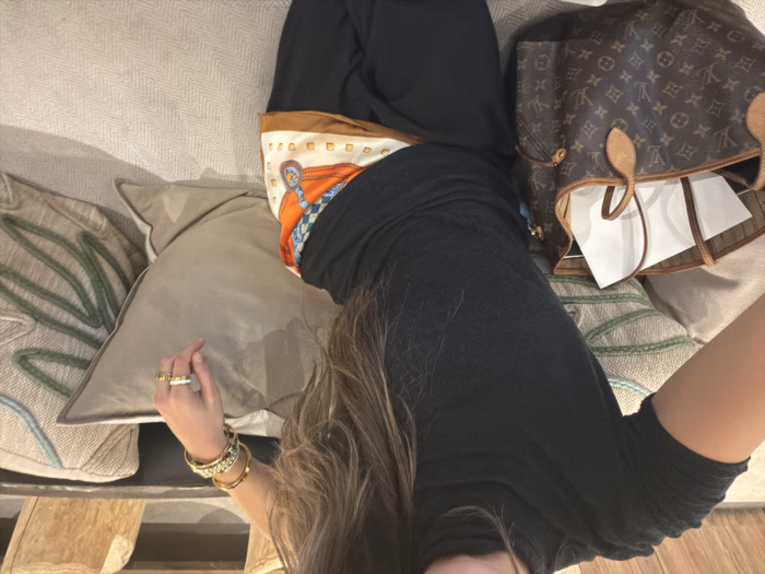 A person lies on a neutral-toned herringbone sofa with decorative pillows. A brown Louis Vuitton tote bag sits to the right, revealing white paper inside. The person wears a black shirt and dark pants, accessorized with a patterned scarf tied around their waist. Their left hand, adorned with gold rings and bracelets, rests on a pillow. The composition is shot from a high angle, giving a casual, relaxed feel.
