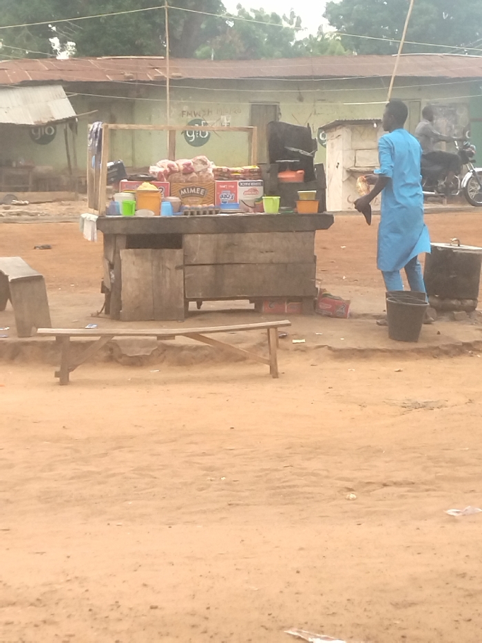 street vendor selling goods from a wooden stand in Asuir, Nigeria (latitude: 7