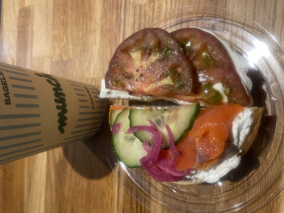 The image displays a meal set on a wooden surface, likely a table. In the foreground, a bagel, cut in half, rests on a clear plastic plate. The left bagel half is topped with a cream cheese spread, layers of smoked salmon, several slices of cucumber, and a garnish of pickled red onions. The right bagel half is also spread with cream cheese and topped with multiple slices of dark red heirloom tomatoes, visibly seasoned with ground black pepper and possibly oil or herbs. In the background, positioned behind the bagel, stands a tan-colored disposable paper cup. The cup features vertical grey stripes and displays "BAGELS" at the top, the brand name "munch" in green script across its middle, and "COFFEE" near the bottom. The presence of the "Munch Bagels" branding indicates the scene is located at a Munch Bagels establishment in Paris, France.