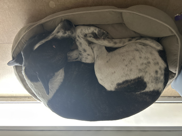- "In an indoor setting, likely in Villa San Andrés, Argentina, a black and white dog is observed sleeping in a tightly curled position within a beige, cushioned dog bed" by FM-j80jY2, licensed under CC BY 4.0
