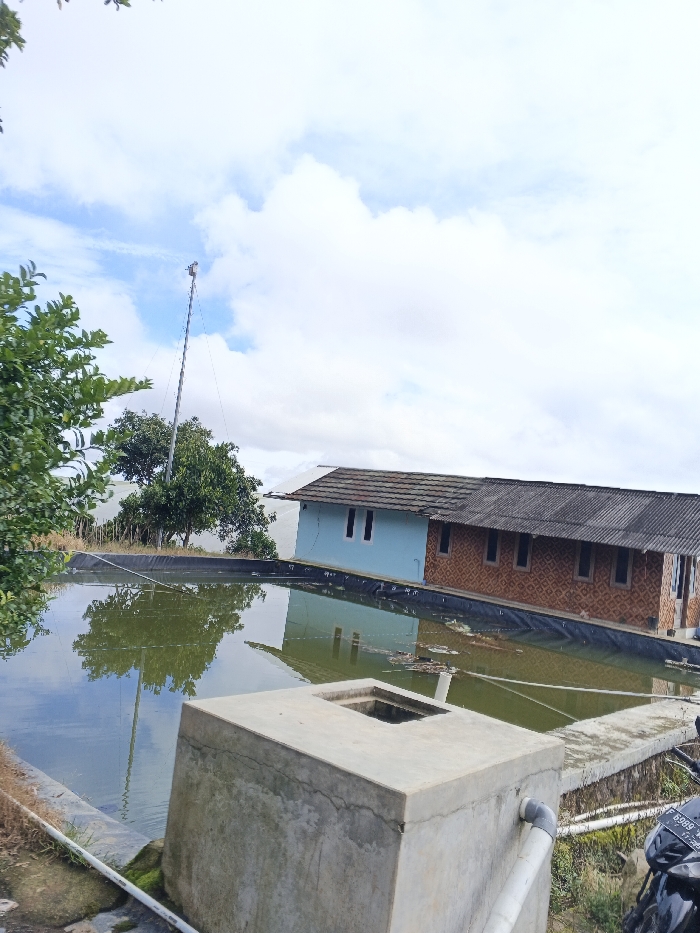 A water reservoir dominates the foreground, featuring a concrete structure in its corner. The water reflects a cloudy sky and a tall metal pole with a sensor. Beyond the reservoir, a long building with light blue and red brick sections rests on the edge, its dark roof contrasting the bright sky. Trees are visible on the left side, along with a portion of a motorcycle in the lower right corner.