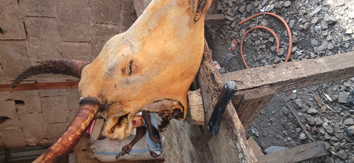 The image captures a scene in what appears to be a butchering or meat processing area within the city of Shaba, Nigeria