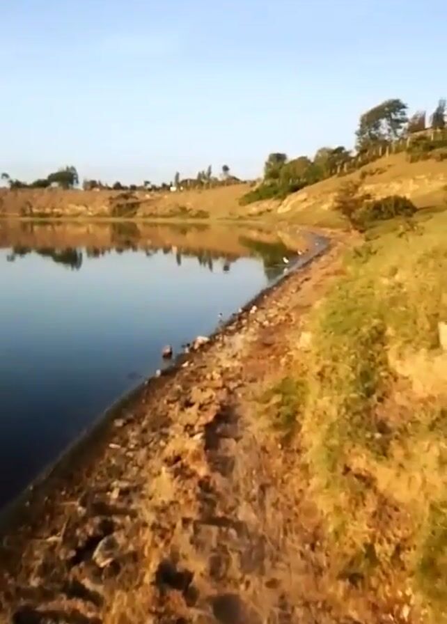 still body of water with trees in the distance. A small brown and black path lines the edge of the water. Several white birds are standing near the water's edge. The sky is blue.