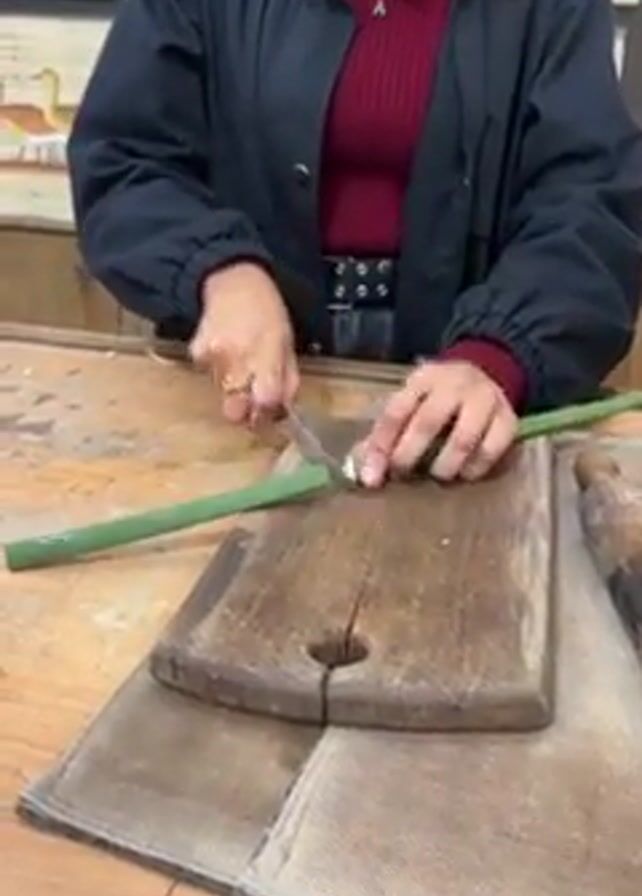 A woman stands at a wooden table and cuts a long green plant stalk in half using a knife and wooden cutting board