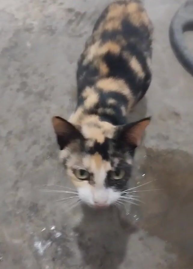 cat standing on a concrete floor. The cat is calico-colored with black, tan, and white fur. It is looking up at the camera. There is a black metal object with a wheel next to the cat. The floor is stained with water or another liquid. The camera moves slightly as the video is recorded. An unseen person speaks in the background.