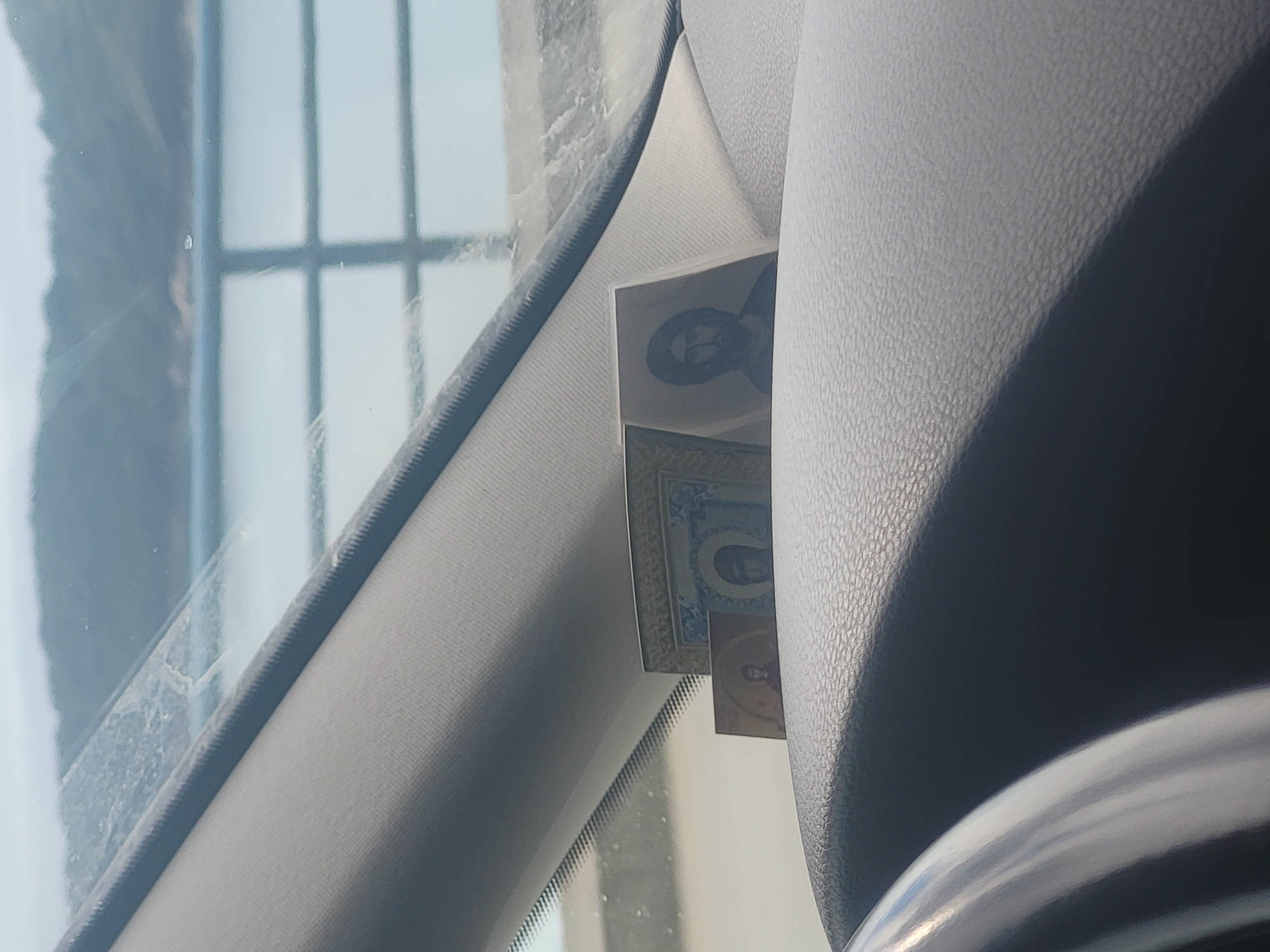 The photograph, taken in Seoce, Montenegro, depicts an interior car view. Two small, rectangular religious icons are wedged between the dashboard and the windshield, near the A-pillar. The icons are partially visible, showing figures that appear to be religious figures. The car's interior is a light gray color with a textured surface on the dashboard. Outside the car, a window with a grid pattern is visible, reflecting an indistinct external environment.