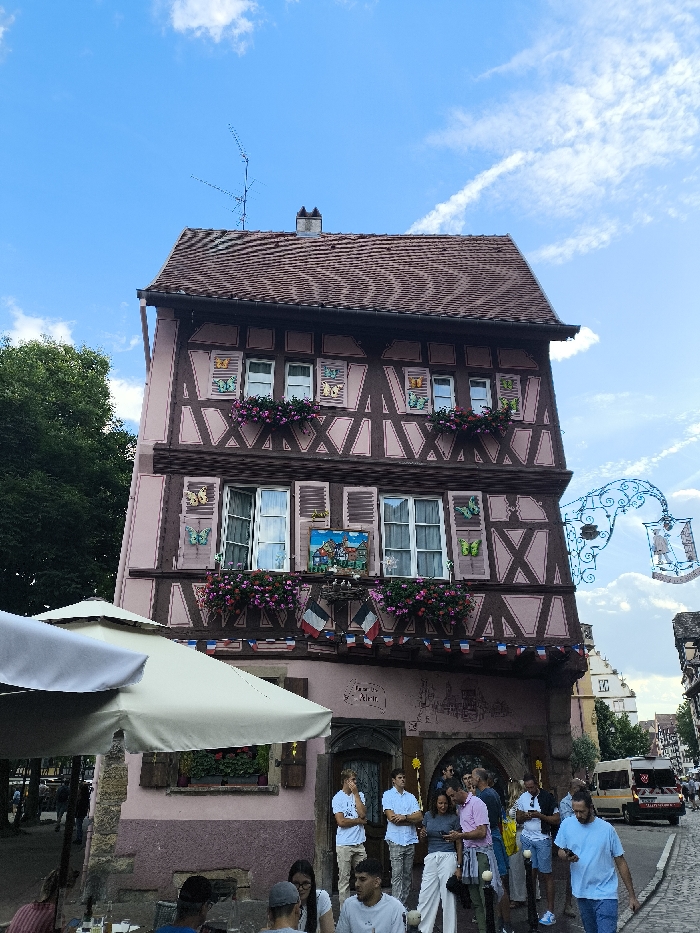 The image displays a multi-story half-timbered building situated on a cobbled street in Colmar, France. The building's facade is painted a pale pink/mauve, contrasted by dark brown exposed timber beams arranged in geometric patterns. It features a steep gable roof with brown terracotta tiles, supporting a television antenna and two chimneys. Multiple windows are present on each floor, with light-colored frames and dark wooden shutters; the shutters on the second and third floors are decorated with colorful butterfly motifs. Flower boxes containing pink and red blossoms are installed below the windows on these upper floors. A vibrant painting of a village scene is mounted between the second-floor windows. The ground level of the building is adorned with two French flags and a string of smaller French flag buntings. A decorative, light-blue wrought-iron sign with scrollwork extends from the building's upper right side. In the foreground, a large, cream-colored octagonal patio umbrella covers an outdoor seating area, partially obscuring the lower-left portion of the building. Several individuals are seated under this umbrella, with others standing on the cobbled street directly in front of the building's entrance. This group consists of approximately ten to twelve adults of varying ages, casually dressed, engaging in conversation or observing phones. One male subject in a light blue t-shirt and jeans walks from right to left across the street. A large green tree is visible on the far left of the frame. The cobbled street curves slightly uphill to the right, revealing additional half-timbered buildings and a white utility van with orange markings in the background. The scene is set under a blue sky with scattered white clouds.