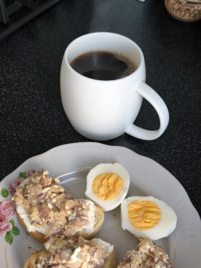 A white mug, filled with dark coffee, sits beside a floral-rimmed plate. On the plate are two halved boiled eggs, their yolks a vibrant orange, and several slices of bread spread with white cream and a fish salad topping. The spread appears to be made with tuna, onions, and mayonnaise. The scene is set on a black countertop, suggesting a kitchen setting.