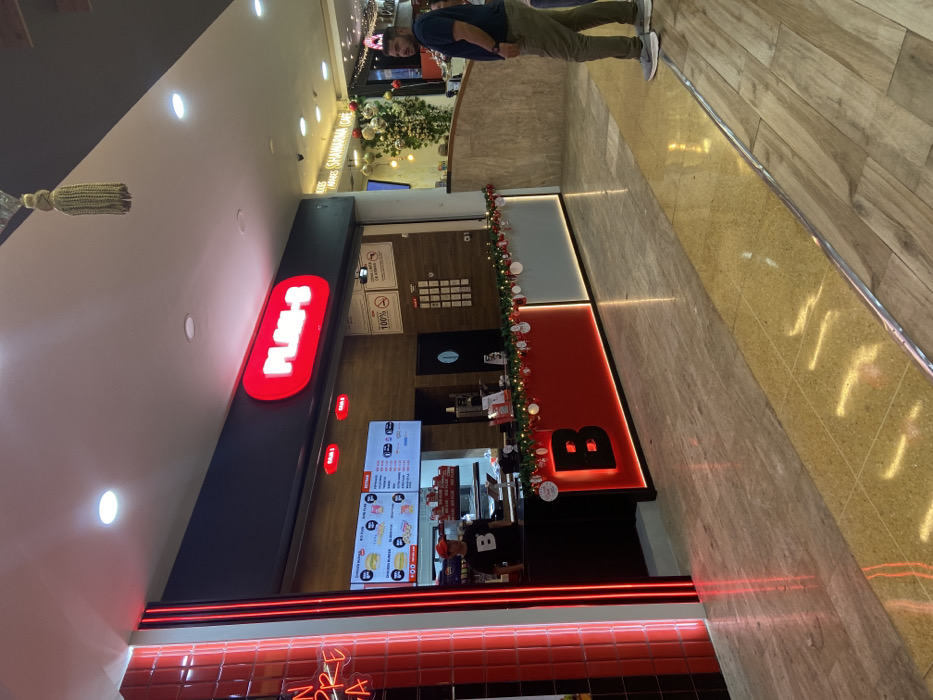 A fast-food restaurant, possibly named "Shawarma Cafe" or "ACES APRES SHAWARMA," is captured in the image. The restaurant features a red and black color scheme with illuminated signage. There is a man in a blue shirt and khaki pants in the upper part of the image. The interior is decorated with holiday ornaments. A second sign with the letter B is visible at the counter. The menu board displays food items.