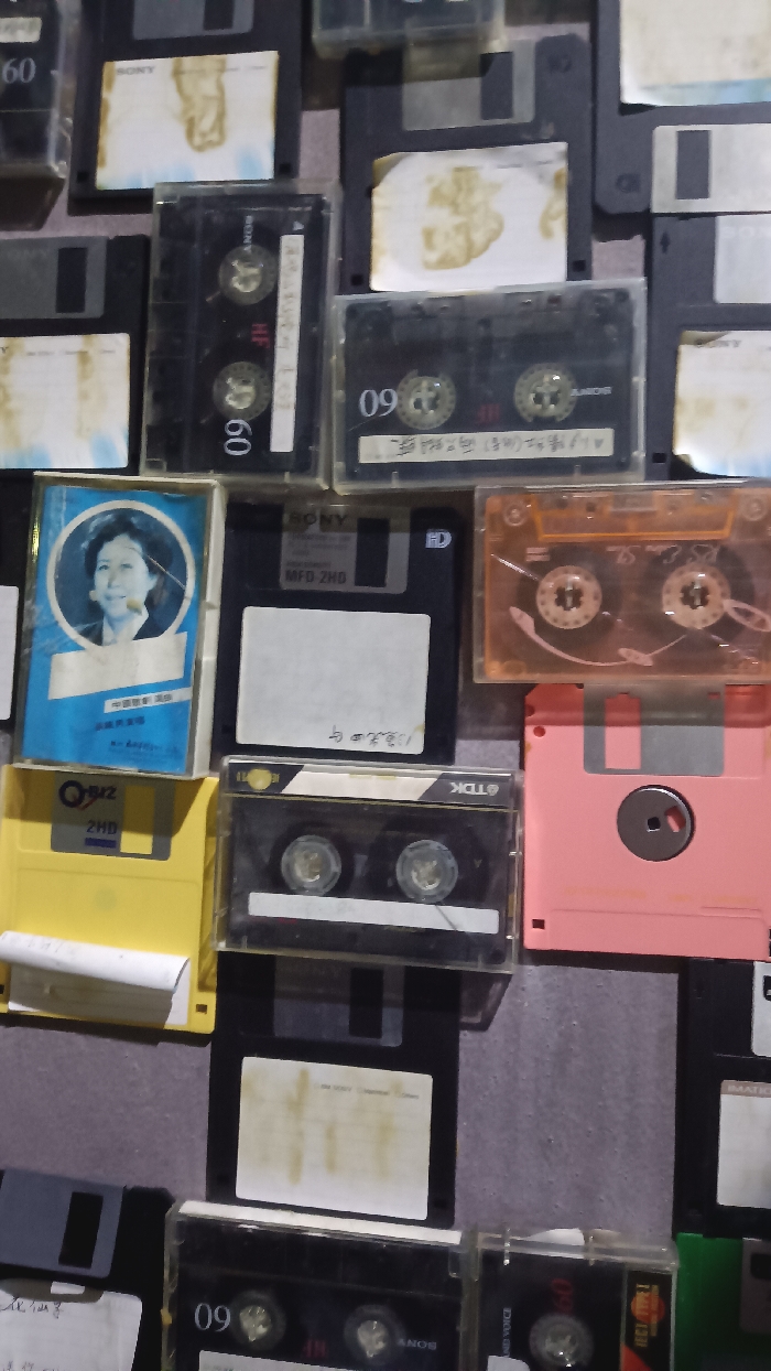 The image displays a dense, vertical arrangement of vintage data and audio storage media, predominantly covering the frame