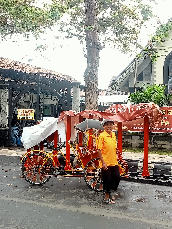 An elderly man in an orange shirt and dark trousers stands beside a colorful pedicab. The pedicab, primarily red and yellow, is parked near a curb. Behind the pedicab are buildings: one with an ornate wrought-iron gate and another with a pointed roofline, possibly a church or religious building. A tree trunk rises behind the pedicab. A sign written in Indonesian, with parking instructions, is visible on a gate. The street is paved and appears slightly wet.