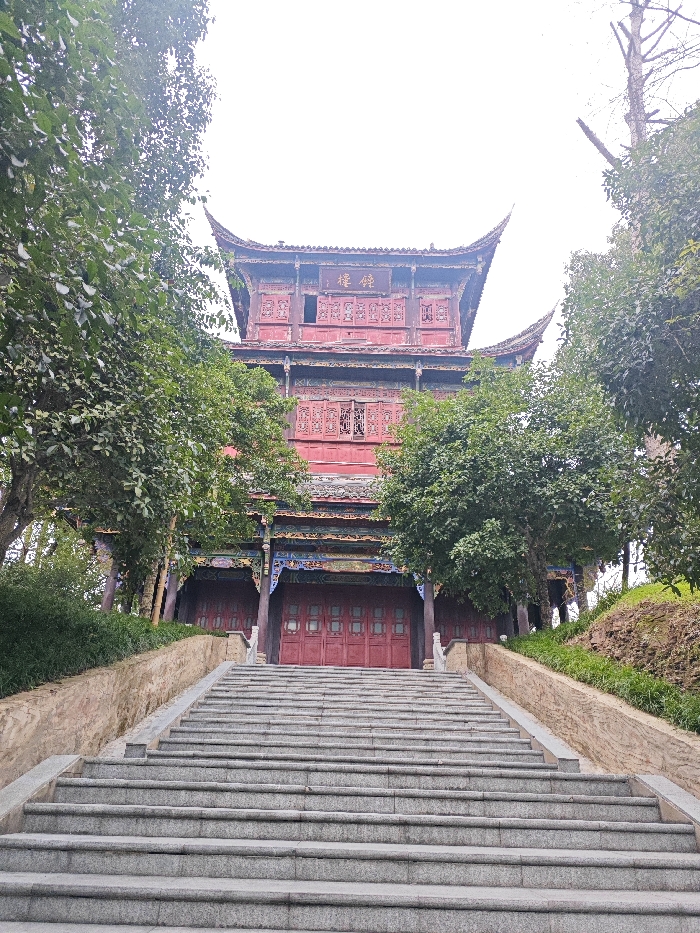 This forensic description details a multi-tiered traditional Chinese building, identified by a horizontal plaque reading "楼碑" (Stele Tower or Monument Tower) on its uppermost red facade, located in Bishan, China. The structure is predominantly red with dark tiled, upturned eaves, featuring intricate decorative patterns in blue, green, and gold along its balconies and window frames. A wide, grey granite staircase with stone railings leads directly up to the building's large red double-door entrance. The staircase is flanked by earthen, terraced slopes covered with green shrubbery and numerous leafy trees that partially obscure the building. The sky above is bright and overcast. No individuals or active interactions are observed in the scene.