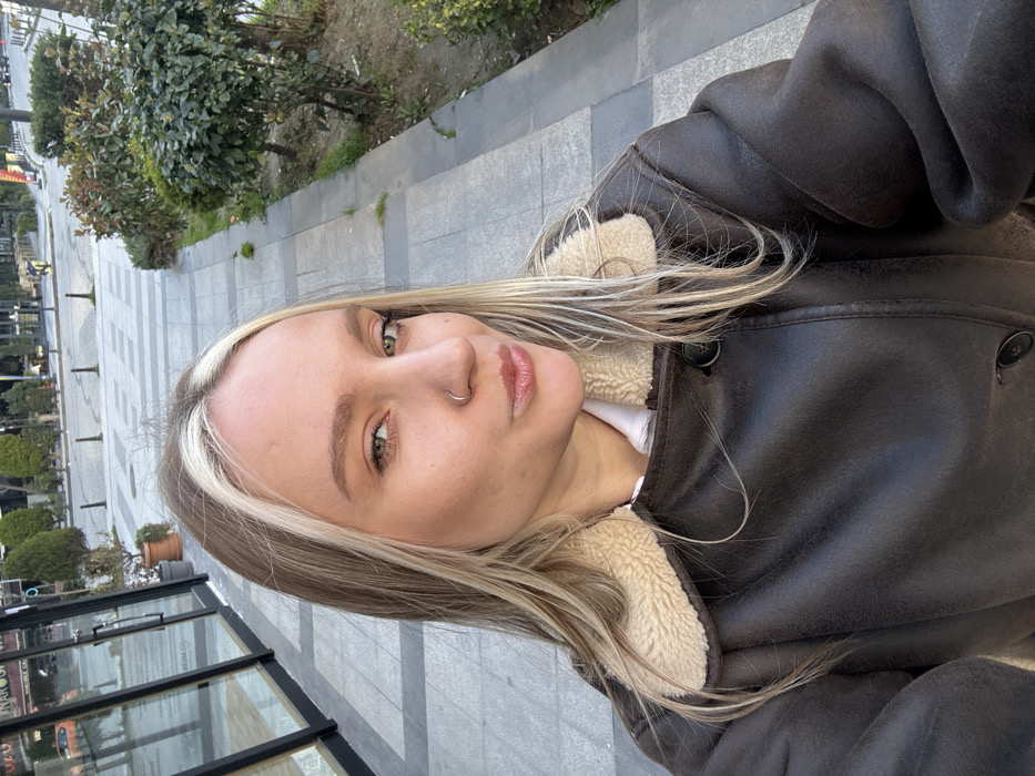 A female subject is depicted in a close-up, self-taken portrait on a paved sidewalk in Başakşehir, Turkey. She has light skin, light-colored eyes, and blonde hair featuring distinct platinum blonde streaks at the front, parted centrally. A small silver hoop nose ring is present on her left nostril. She wears a dark brown faux-shearling jacket with a cream-colored fleece collar, over a white-collared garment. The background to her left reveals a glass-fronted commercial building with a sign displaying partially legible text, including "İNANOĞLU GRP." To her right, a narrow landscaped strip contains green bushes and shrubs. Beyond this, a wide paved area, possibly a pedestrian plaza or street, is visible, lined with dark bollards, extending towards indistinct structures in the distance under natural daylight.