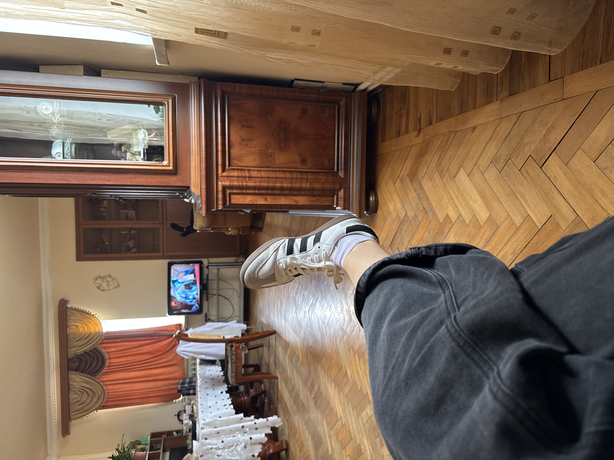 The scene depicts an interior residential space in Nor Artamet, Armenia, viewed from a low perspective. In the immediate foreground, a person's left leg is extended, clad in dark grey, relaxed-fit trousers. The visible foot wears a white sneaker with black stripes (resembling an Adidas Samba style) and a white ankle sock. The floor is covered with light brown wooden parquet arranged in a herringbone pattern. In the midground, to the right, stands a tall, dark brown wooden hutch with intricate wood grain. Its upper section features a glass display case reflecting interior light, while the lower section consists of solid wooden doors. To the left of the hutch, a small television set on a metal stand displays brightly colored, possibly animated, content. Further left, a dining table covered with a white lace tablecloth is visible, surrounded by wooden chairs. One chair has a white garment draped over its back. A window in the background is partially covered by layered, ornate curtains in shades of brown, gold, and orange-red, admitting natural light. The walls are painted a light, neutral color. A simple outline of a face or figure is affixed to the wall above the television. Potted plants are visible on a shelf or cabinet in the far left background. A sheer, light-colored curtain hangs vertically along the right edge of the frame.