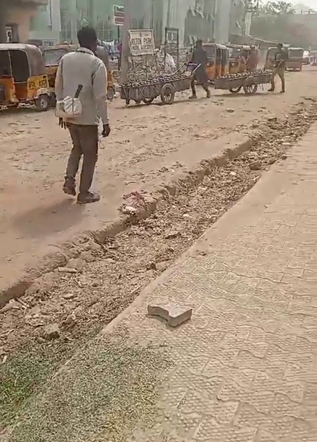 man walking away from the camera down a dusty, partially paved street in an urban environment. Several yellow auto-rickshaws (tuk-tuks) are parked or moving on the street, and a couple of people are pushing carts loaded with what appear to be watermelons. The street has a wide, unfinished median area with exposed soil and debris. On the right side of the frame is a paved walkway with a distinctive repeating geometric pattern. Buildings are visible in the background, and streetlights line the road. The sky is overcast, contributing to a muted color palette throughout the scene.