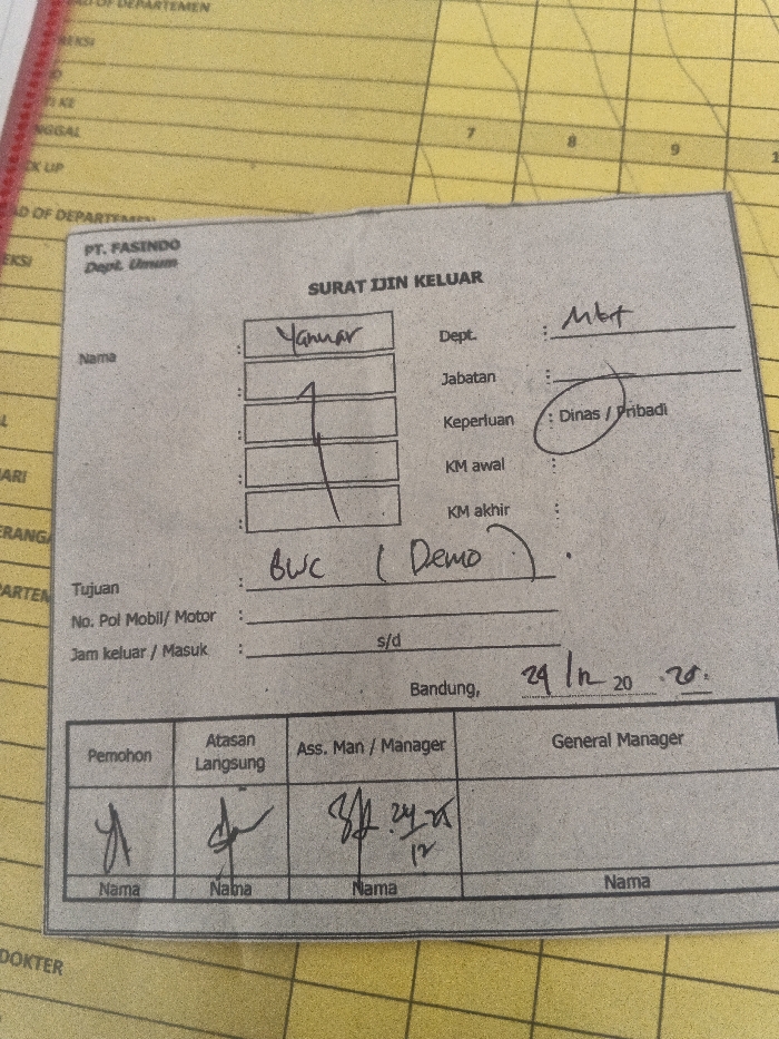 scanned document titled "Surat Ijin Keluar" (Exit Permit). It appears to be a form from "PT. FASINDO, Dept. Umum." The form includes fields for name (Yanuar), department (Mbt), job title, reason (Dinas/Pribadi - Business/Personal), and destination (BWC (Demo)). The date Bandung, 29/12/2020 is written on the bottom. There are sections for signatures: Applicant, Supervisor, Assistant Manager/Manager, and General Manager, with signatures present for the first three. The handwritten portions are somewhat illegible.