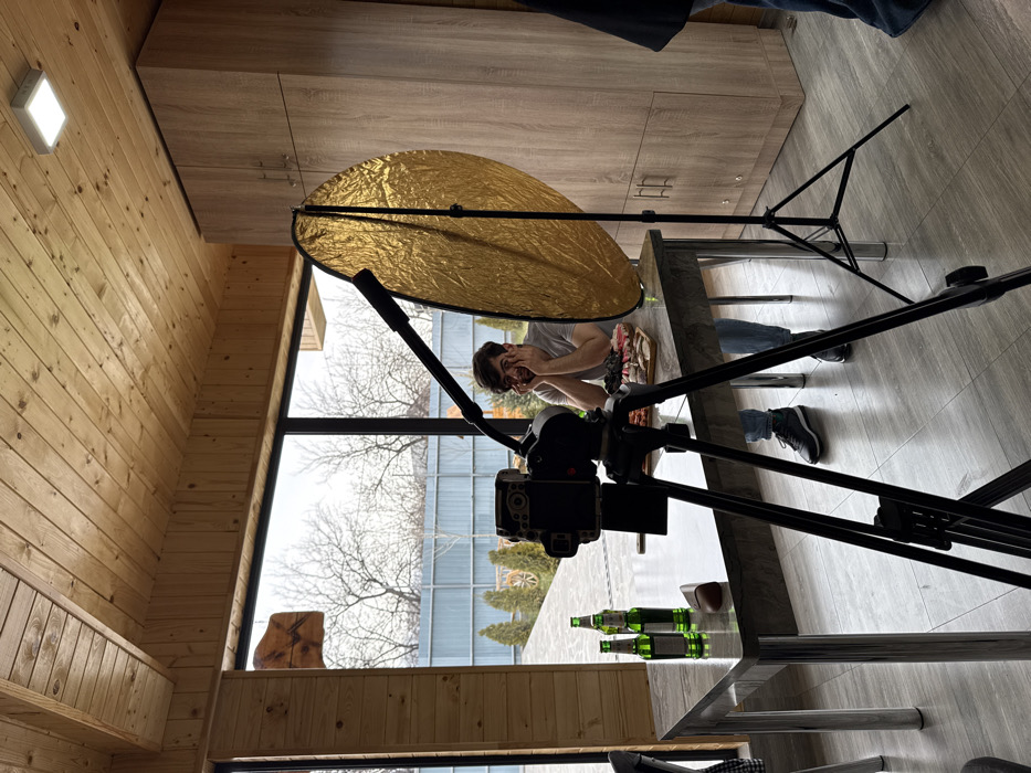The image depicts an indoor scene within a modern wooden structure in Voskevaz, Armenia, featuring a video or photography setup. The room features a light-toned wooden plank ceiling and a matching wooden wall on the left, contrasting with a gray tiled floor. A large window occupies the background, revealing an outdoor area with bare deciduous trees, a light-colored corrugated fence, and some small evergreen shrubs. In the foreground, a black camera is mounted on a black tripod, positioned centrally and aimed towards a gray table. To the right of the camera, a large, circular gold-colored reflector on a black stand is angled towards the table. A tall, light-brown wooden cabinet with multiple doors is visible on the right side of the room. A square LED light fixture is mounted on the ceiling. A male individual with dark hair and glasses, wearing a light-colored t-shirt and blue jeans, is seated at the gray table, facing the camera. He is actively posing with a humorous expression, pressing his hands against his cheeks and slightly opening his mouth. On the table, to his left, are two green glass bottles. In front of him, a wooden cutting board holds an arrangement of dark grapes and various sliced meats or cheeses. A small, reddish-brown object rests on the table. A second individual is partially visible on the far right, wearing dark clothing and blue jeans.