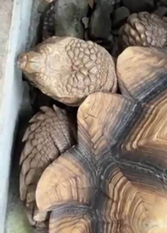 - "In a high-angle, close-up shot, a large, brown-skinned tortoise rests in a corner formed by a low concrete wall and a wooden object" by FM-wUaYc2, licensed under CC BY 4.0
