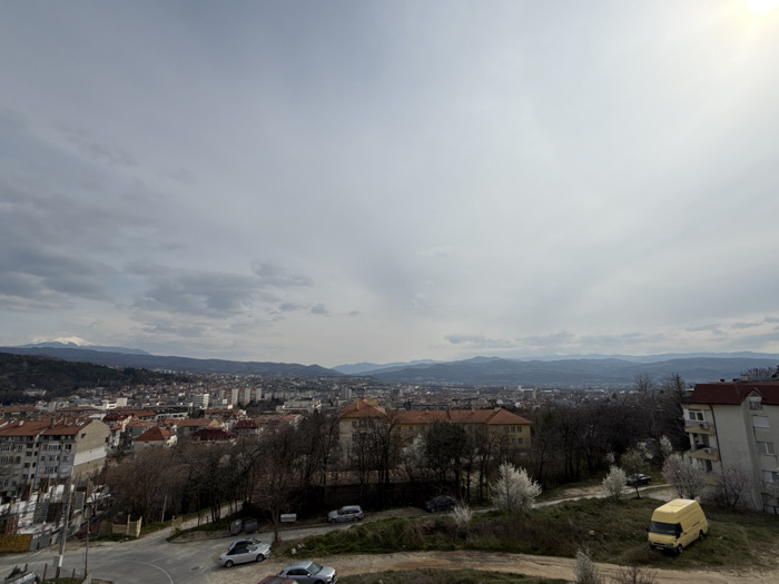 The image displays an elevated, wide-angle view of the city of Blagoevgrad, Bulgaria, under an overcast sky with a discernible bright spot of sunlight in the upper right. Distant mountain ranges frame the horizon, with a prominent snow-capped peak visible on the far left. The urban landscape in the midground features a dense array of buildings, including multi-story residential blocks with reddish-brown tiled roofs on the left. An active construction site with exposed rebar is present in the lower-left. In the central midground, a cluster of larger buildings with distinctive yellowish-orange tiled roofs is visible, interspersed with bare deciduous trees and several trees bearing white blossoms. Towards the right, additional residential structures are observed, including a multi-story light-colored apartment building with a red roof. The foreground includes a paved, curving road in the lower-left, where two light-colored sedans are parked. A grassy, uneven slope with an unpaved dirt path occupies the lower-right, on which a yellow commercial van is parked. No individuals are visible.