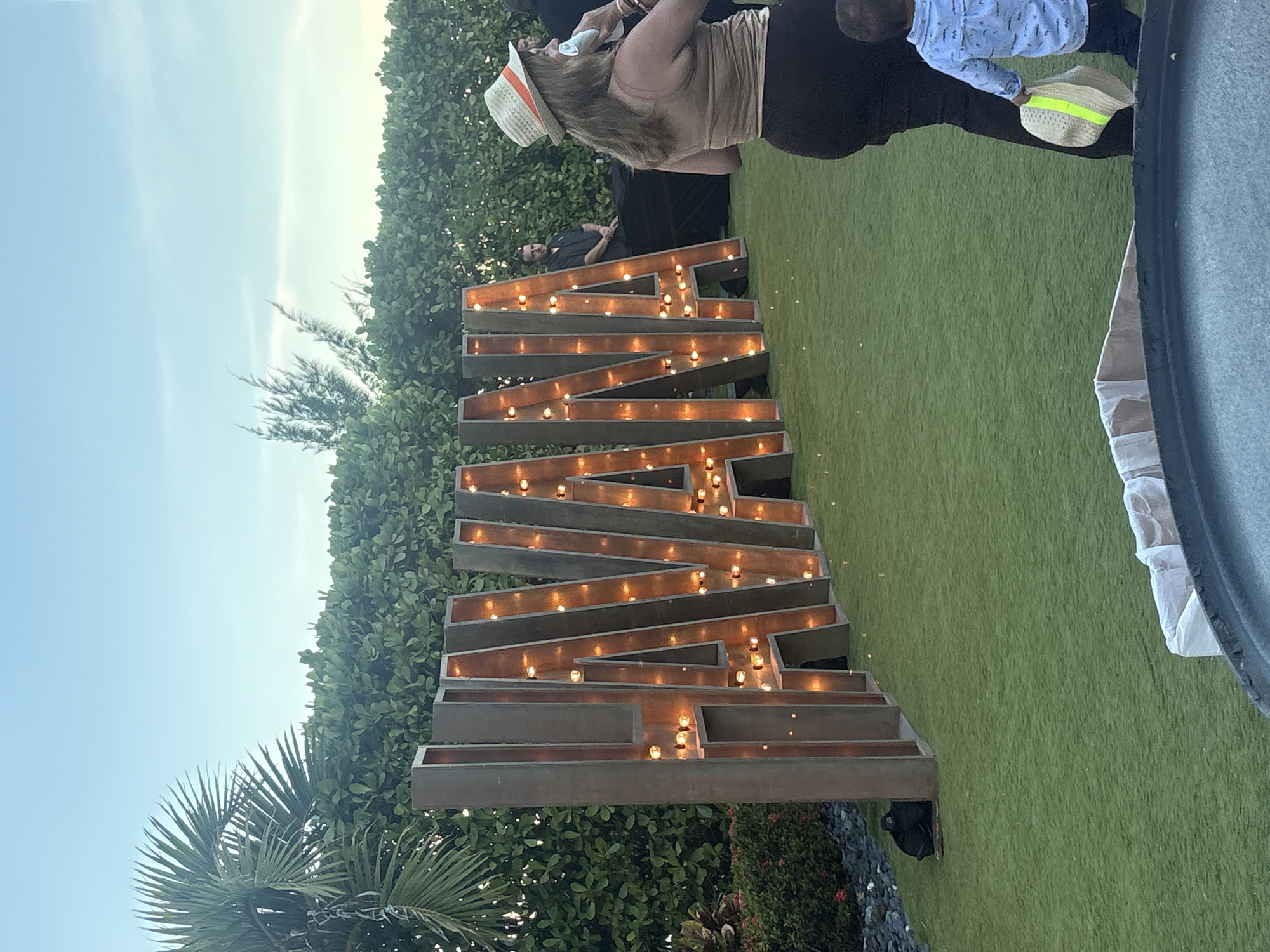 Captured at an outdoor event in Miami Beach, United States of America, the image presents a scene on artificial green turf, flanked by meticulously manicured hedges. A large, illuminated "AWAKEN" sign dominates the view, its metallic letters studded with light bulbs, casting a warm glow. Several individuals are present: one, wearing a hat with orange and white accents, stands in proximity to the sign. Another lies on the ground behind the sign. A second individual, dressed in a patterned blue shirt and wearing a hat with yellow and white accents, is partially visible at the image's top edge. A tent, partially within the frame, stands in the background. A palm tree is on the left side of the picture. The sky above suggests either early morning or late afternoon light.