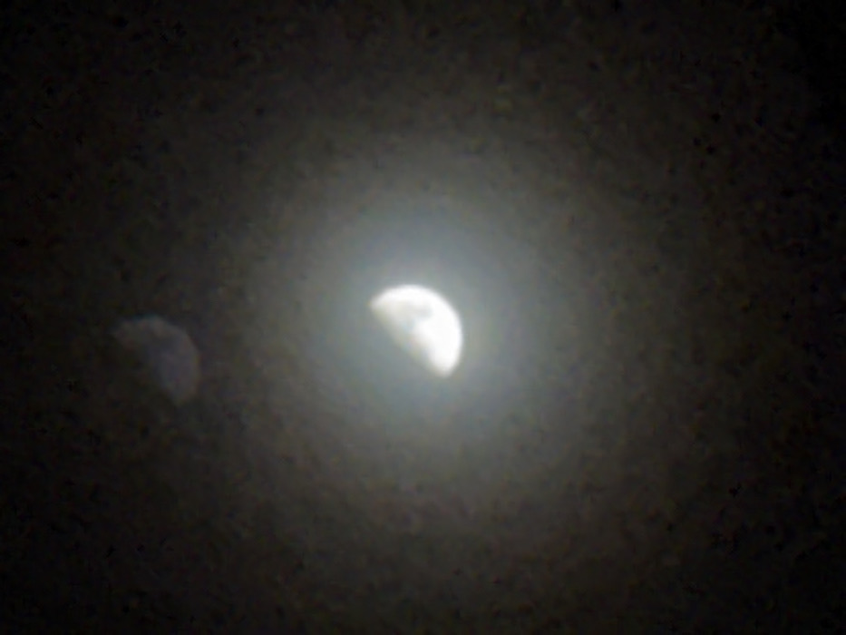 The image depicts a nighttime sky over Bischheim, France. The primary subject is a distinct, brightly illuminated half-moon (first quarter phase) positioned centrally within the frame, surrounded by a diffuse glow. Above and slightly to the left of the main moon, a fainter, significantly blurred, crescent-shaped luminous anomaly or reflection is visible. The environment is dark, suggesting a night scene, with potential atmospheric haze or motion blur contributing to the diffuse light and overall softness of the image. No other celestial bodies, terrestrial objects, people, or actions are discernible.