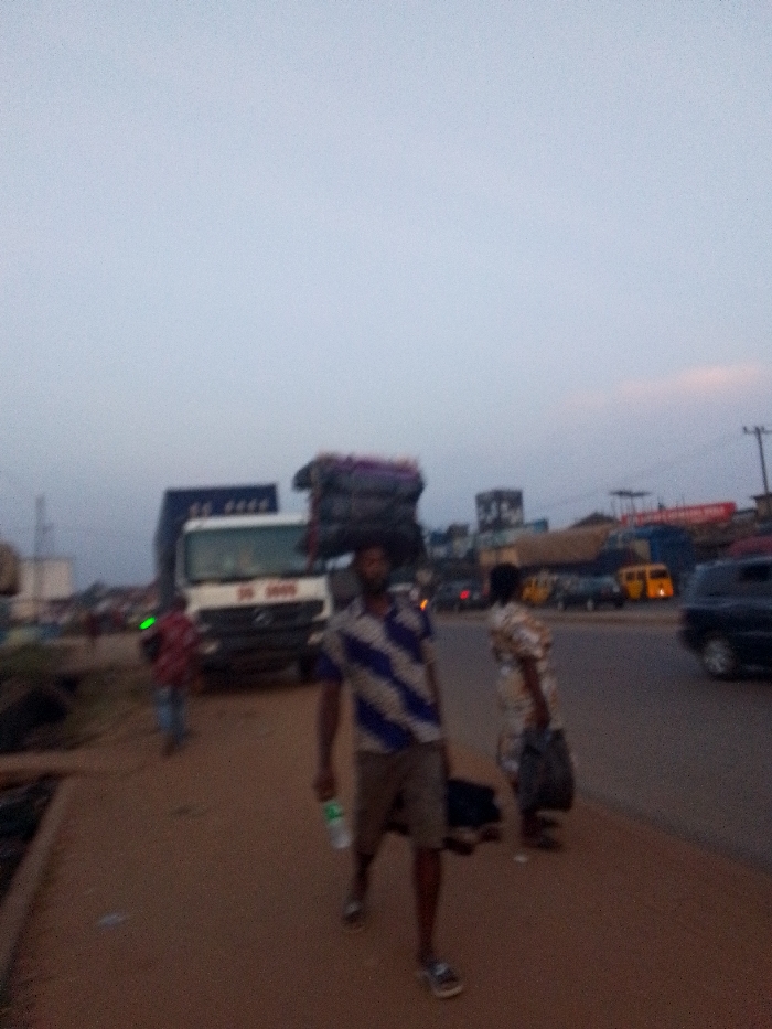 A blurry, street-level shot shows a man carrying a large load on his head, walking on a dirt shoulder next to a road. He wears a striped shirt and shorts, and carries a water bottle. A truck is parked nearby. Other pedestrians and vehicles, including a yellow taxi, are also present. The sky is overcast and the scene appears to be taken at dusk or dawn. Buildings and a utility pole are visible in the background.