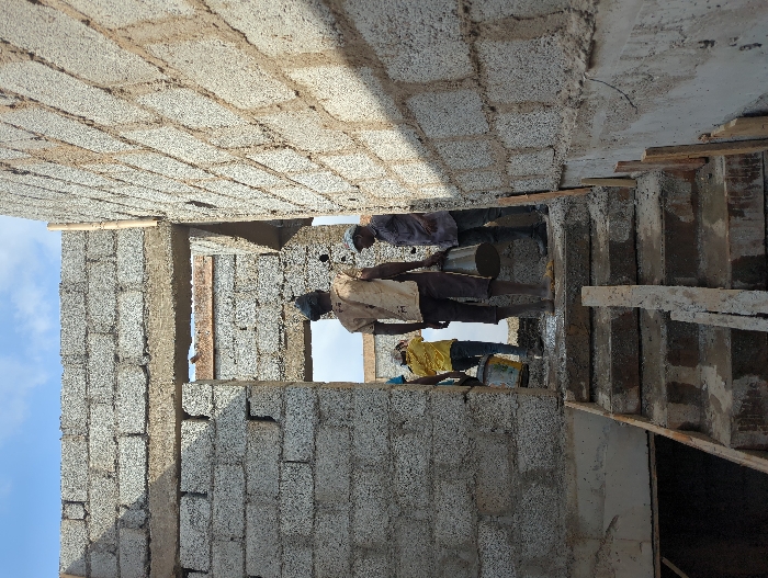 The image depicts an active construction site within an unfinished building in Karsana 2, Nigeria