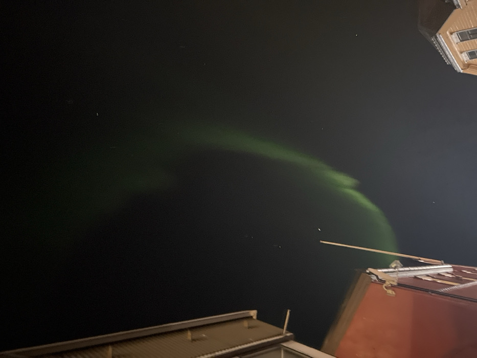 The image displays a nighttime urban scene in Tromsø, Norway. A prominent green aurora borealis extends across the dark sky as a broad, curved band of diffuse light, with varying intensity. Sparse stars are visible throughout the firmament. In the lower-left portion of the frame, a building with a reddish-orange facade is partially visible, featuring a dark, possibly corrugated roofline. A slender, light-colored pole protrudes vertically from this structure, partially intersecting the aurora. In the lower-right, a second building exhibits a light brown facade with two visible dark-framed windows and a dark, pitched roof. A light-colored accumulation, consistent with snow, lines the edge of the roof. The scene depicts a clear, cold night in an urban environment at a high latitude, with the natural phenomenon of the aurora borealis as a central feature. No individuals or specific actions are depicted.