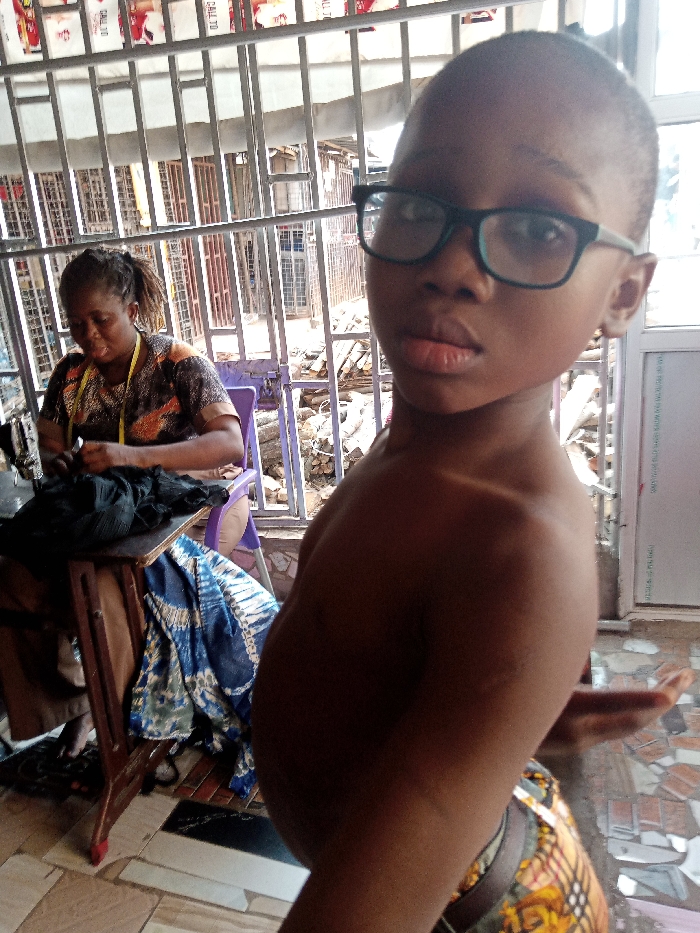 This image captures an interior scene, identified as being in Onitsha, Nigeria, likely a small tailor's shop or workshop. In the immediate foreground, a young Black child, with closely cropped hair and wearing black-rimmed glasses, faces the viewer directly with a neutral expression. The child is shirtless, revealing the upper torso, and a multi-colored patterned fabric, resembling a wrapper, is visible around the lower body. In the background, to the left, an adult Black woman is seated on a purple plastic chair, actively hand-sewing a piece of black fabric. She wears a short-sleeved, patterned top, and a yellow measuring tape is draped over her shoulders. A small wooden stand supports the black fabric she is working on, with a blue and white patterned cloth draped over the stand's base. The environment behind the individuals features a series of grey metal security bars or grilles, providing a partial view of an outdoor area. Beyond these grilles, scattered construction debris, possibly wood scraps, and the outlines of other structures or market stalls are visible. Faint, faded posters with text, including "CALL 70", are partially discernible overhead through the grilles. The floor in the foreground consists of large, geometrically patterned tiles in shades of brown, black, and white.