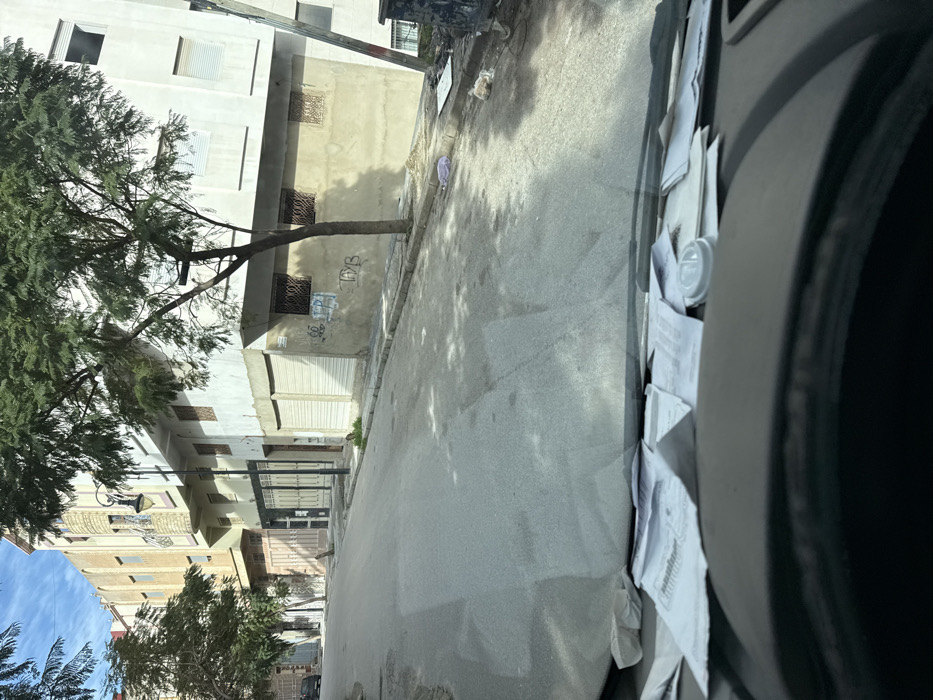 The image depicts an urban street scene in Tangier, Morocco, viewed from the interior of a vehicle. In the immediate foreground, the dark dashboard of the vehicle is visible, heavily populated with various papers, possibly receipts or notes, and a small, clear plastic cup with a lid. The view through the windshield shows a paved, upward-sloping street with visible tire tracks and scattered shadows, indicating daylight. To the left, multi-story buildings line the street, featuring various architectural styles, neutral-colored facades, and some upper-level balconies. Ground-floor units typically have closed, corrugated metal roll-down shutters. A street lamp with an ornate fixture stands on the left sidewalk. On the right side of the street, a large, leafy green tree partially obscures a white multi-story building. The lower section of this building displays a different, light-beige concrete finish with barred windows. Graffiti, including the text "66" and "TAYB" (or similar script), is visible on the lower wall. A closed roll-down shutter is present on the ground floor. Further down the right sidewalk, a dark-colored garbage bin is situated next to the building, surrounded by some loose debris and litter. The sky above is partially visible, showing clear blue with sparse white clouds. No individuals are discernible in the scene.