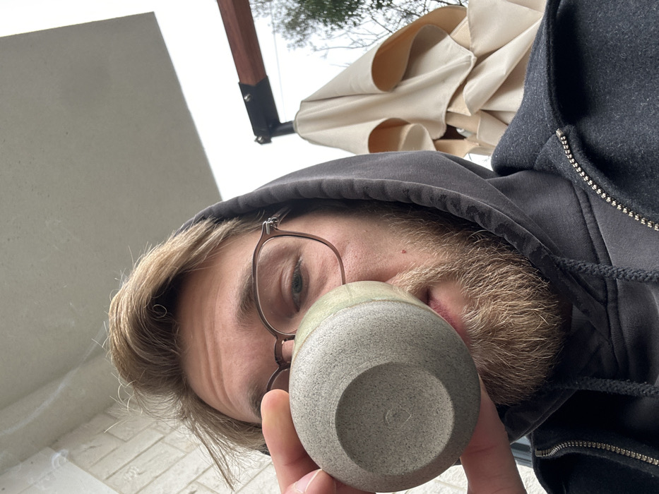 A close-up photograph depicts a male individual, partially obscured, holding a small, textured light grey-green ceramic cup to his mouth with his right hand, appearing to drink. He has light brown hair and a beard, and wears eyeglasses with light brown frames. He is dressed in a dark grey hooded sweatshirt, with the hood up, under a black zippered jacket. In the background on the right, a folded beige patio umbrella with a dark metal stand and a wooden beam is visible. A light-colored textured wall is present on the left. The sky appears overcast. The scene is located in Budva, Montenegro.