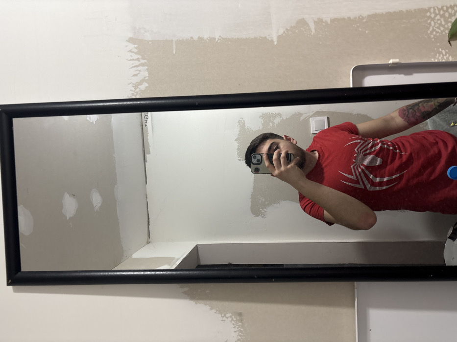 An interior scene in Erden, Bulgaria, depicts a male subject capturing a mirror selfie. The individual, possessing short dark hair and light facial stubble, wears a red short-sleeved t-shirt with a prominent white Spider-Man logo. He holds a light-colored smartphone in his right hand, obscuring the lower portion of his face, to photograph his reflection in a tall, black-framed rectangular mirror. A multicolored tattoo, appearing as a floral or tree-like design, is visible on his left forearm. The background, both reflected in the mirror and partially visible outside its frame, consists of walls in an apparent state of renovation or unfinished decoration, characterized by patches of lighter plasterwork, uneven paint application, and a white electrical switch or outlet. The reflected ceiling also shows visible repairs. A partially obscured white rectangular object is visible in the lower right reflection. The environment appears utilitarian and under construction.