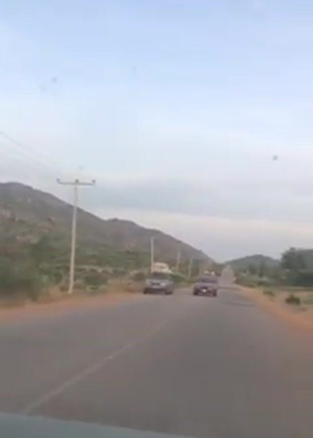 drive on a paved road through a rural landscape. In the initial shot, the road stretches ahead toward a large, rocky mountain or hill. Power lines run alongside the road. There are a few buildings visible on the left, and a few cars are driving in the opposite direction. The subsequent shots provide a clearer view of the landscape. The area is dry, with sparse vegetation and rocky hills in the background. The sky is overcast. The road is mostly empty except for the car the footage is taken from.