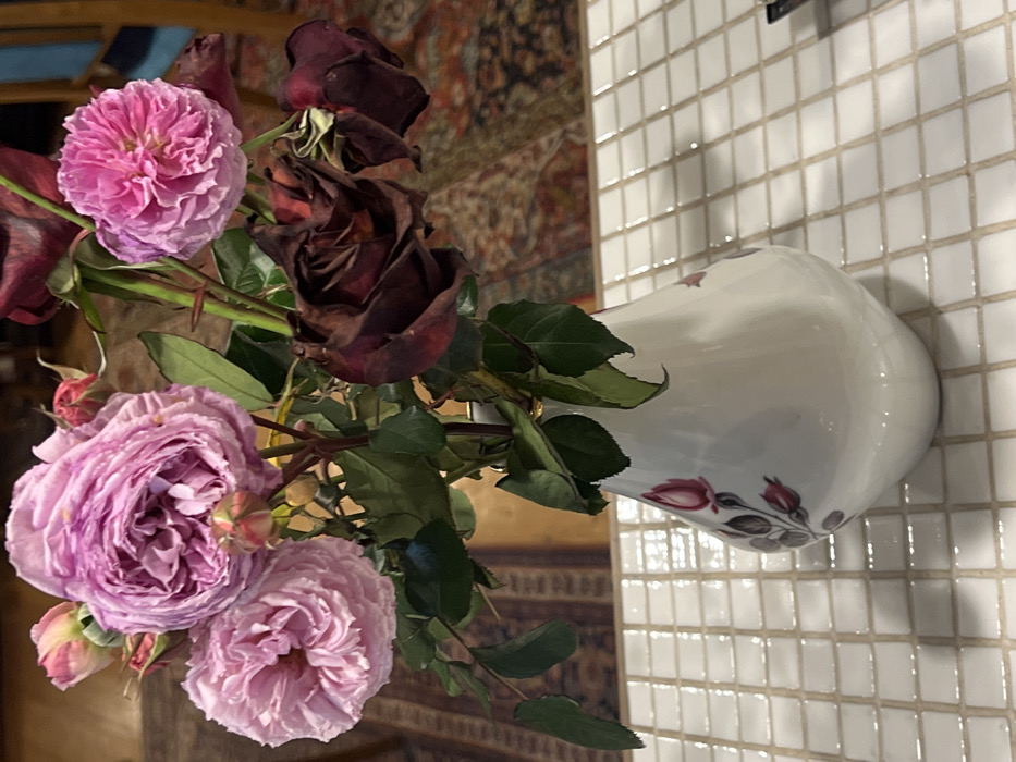The scene is set indoors in Argveta, Georgia. A white, pear-shaped ceramic vase, adorned with pink and dark gray rosebud motifs and featuring a gold-colored rim, is positioned centrally. The vase holds a mixed bouquet of roses. The bouquet consists of several vibrant pink to lavender-pink roses in full bloom, one smaller, compact pink rose, and multiple dark red, withered, and decaying roses with shriveled petals. Green stems and leaves are visible throughout the arrangement, some exhibiting minor wilting. The vase rests on a white tiled surface composed of small, square tiles with visible grout lines. The background is out of focus, revealing a patterned rug or carpet with shades of brown, red, and beige, along with indistinct furniture elements. No individuals are present, and no specific actions or interactions are depicted.