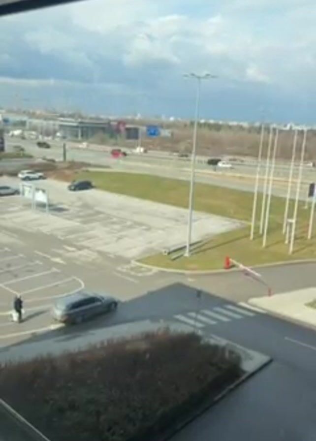 view from a window overlooking a parking lot and a highway. A person is walking across the parking lot towards a grey car. The parking lot has several empty parking spaces marked with white lines. Beyond the parking lot, there is a multi-lane highway with cars moving in both directions. There are streetlights and tall white poles along the edge of the parking lot. A red and white barrier arm is partially raised near a pedestrian crosswalk. The sky is cloudy with patches of blue. In the distance, there appear to be industrial structures or cranes.