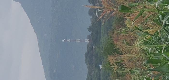The image depicts an outdoor scene in Kitonyoni, Kenya, under an overcast, light-grey sky. In the foreground, a dense field of mature corn (maize) plants occupies the lower half of the frame, characterized by green stalks, broad leaves, and prominent yellowish-brown tassels. The midground features a red and white striped communication tower, likely a cellular or radio mast, rising from a densely vegetated area composed of green trees and shrubs. A small, light-colored structure is partially visible among the trees below and to the left of the tower, with another structure featuring a light-blue or white roof visible further to the left. The background is dominated by a large, vegetated mountain range or series of hills, appearing hazy and extending across the upper portion of the scene. No individuals, animals, or specific actions are discernible.